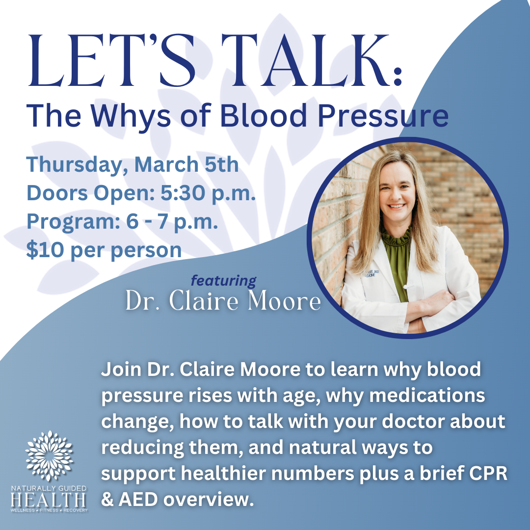 Back to All Events LET’S TALK: the whys of blood pressure Thursday, March 5, 2026 6:00 PM 7:00 PM Naturally Guided Health, LLC 2594 Government Street Ocean springs United States (map) Google Calendar ICS WHEN: Thursday, March 5th, 6-7 pmWHERE: Naturally Guided Health - 2594 Government Street, Ocean SpringsCOST: $10 per personSee less Purchase